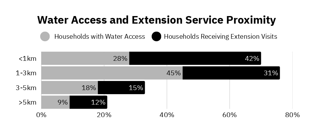 Figure 3 shows stark disparities in water access and extension services by distance from water sources. Households within 1 km of water are three times more likely to receive agricultural extension services (42%) than those 3 to 5 km away (15%). As distance increases, water access declines sharply, from 28% at less than 1 km to 9% beyond 5 km, while extension services marginally improve at remote locations, 12% beyond 5 km, likely due to mobile units. However, 73% of households beyond 1 km face limited water and technical support, heightening climate vulnerability.