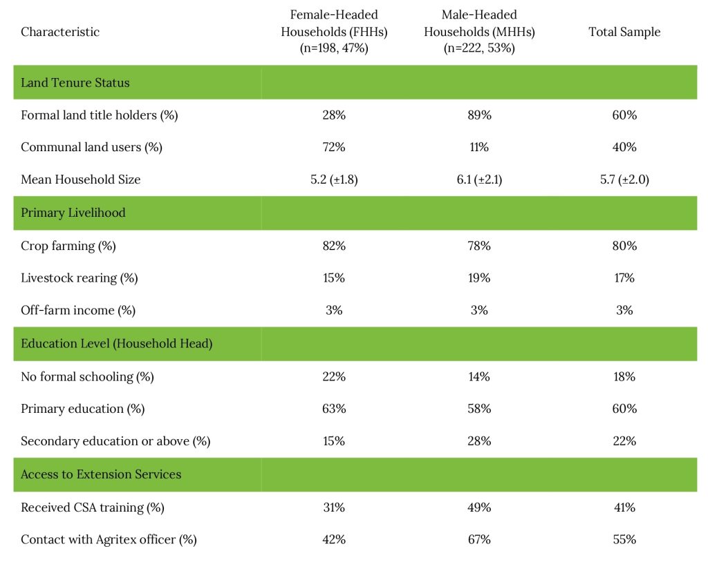 This section presents data that highlights the significant disparities in climate-smart agriculture adoption patterns between male-headed and female-headed households across Chivi District. Tables, figures, and thematic analyses are used to illustrate key findings, underpinning the intersection of gender, tenure security, and climate resilience. Table 1 summarises the demographic characteristics of 420 surveyed households in Chivi District.