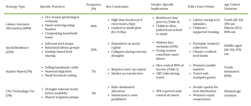 Table 3 presents a thematic analysis of women’s climate adaptation strategies in Chivi District based on 24 focus group participants. Labour-intensive strategies dominate (68%), including dry-season gardening in wetlands, hand-watering, and composting, consistent with Saran et al.’s (2024) findings on women's agricultural labour burden. These practices demand significant time, often on small plots, with children frequently involved. Social resilience strategies such as seed swaps and rotational labour groups account for 22%, relying on social capital but vulnerable to breakdowns during drought, as noted by Managa et al. (2023). Market-based approaches and climate-smart technologies are less common (7% and 3%), constrained by financial exclusion and male control over assets, reflecting analyses by Atta-Aidoo and Antwi-Agyei (2025) and Erel et al. (2017). Age cohort differences show that elderly women engage more in labour-intensive methods while youth participate more in market-based activities (Sato & Alarcon, 2019).