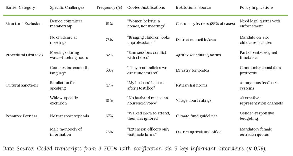 Table 5 identifies barriers to women’s participation in climate planning from 24 focus group discussions. Only 12% of women registered in climate-smart initiatives participate in decision-making, despite 58% household registration. Structural exclusion is widespread: 61% of women are denied committee membership, mostly enforced by customary leaders (89%), with widows facing the highest exclusion at 91% due to village court rulings. Procedural barriers include meeting times that clash with water-fetching hours (82%) and lack of childcare (73%). Nearly half (47%) reported retaliation, including domestic violence, for speaking out, illustrating a risky environment for women’s engagement (Erel et al., 2017). Resource constraints persist, with 67% lacking transport stipends and 78% reporting male monopoly over agricultural information. As one village head admitted (Participant 5, key informant):