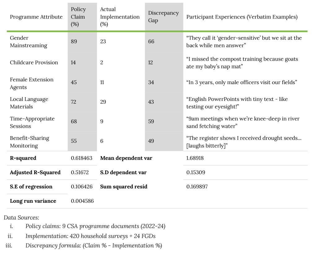 Table 6 exposes a persistent disconnect between CSA programme rhetoric and lived realities in Chivi District, with implementation lagging behind policy claims by 12–66 percentage points across all attributes. This gap is most acute in gender mainstreaming and time-appropriate training, where institutional indifference renders women’s inclusion largely symbolic. The near absence of childcare, female extension agents, and local language materials reveals that “gender-sensitive” programming often amounts to performative compliance rather than substantive change; what Brisebois et al. (2022) term “convenient synergies.” Women’s narratives highlight how these failures perpetuate exclusion and force reliance on labour-intensive coping (see Table 3), while benefit-sharing remains largely a “paper reality” controlled by male elites. These contradictions reinforce the cycle of exclusion and time poverty quantified in Tables 4 and 5, demonstrating that technical fixes without structural accountability are insufficient. The findings call for rigorous, participatory monitoring of CSA initiatives, with metrics set and verified by women themselves, to close the credibility gap and drive genuine empowerment.